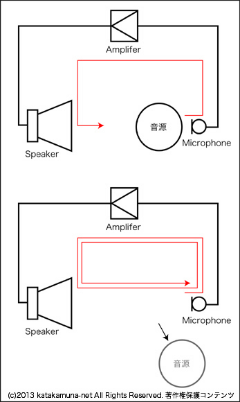 音響現象で、マイク、スピーカーの間に発生するハウリング、フィードバックと呼ばれる状態も、この「コ」であると言えます。(※コダマなどの日本語にその名残りがあります。)