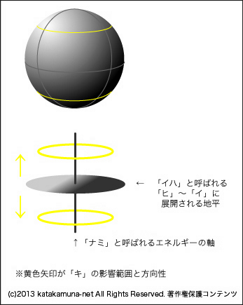 では「キ」とは何かと言いますと…、文献では、物質性を形成する渦巻き円盤状の場における「カム」からのエネルギー「カ」の差、つまりエネルギー傾斜による様々な事象を「サ」と呼んでいます。その「サ」に対して、渦巻き円盤状の場の求心力となっている見えざる軸にも同様にエネルギー差があり、その差について「キ」と呼んで、場のエネルギー傾斜、及びそれに附随する事象「サ」と区分しています。